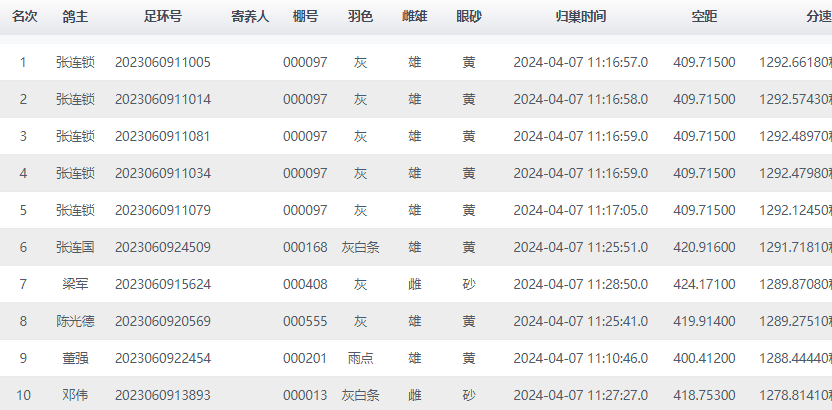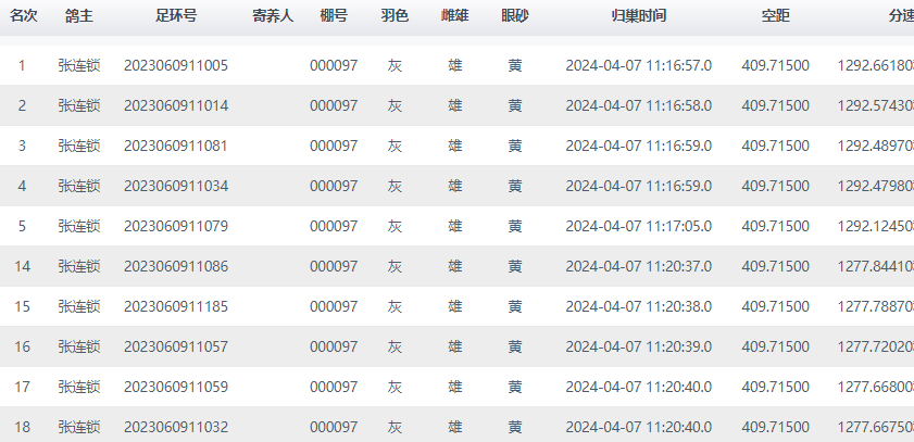 鸽主张连锁成本场比赛最大赢家,其名下5羽赛鸽分别拿下前五名,10羽赛鸽进入前二十名,实力霸榜!冠军鸽环号2023060911005,于11点16分57秒报进,分速1292.6618米/分。更多成绩>>