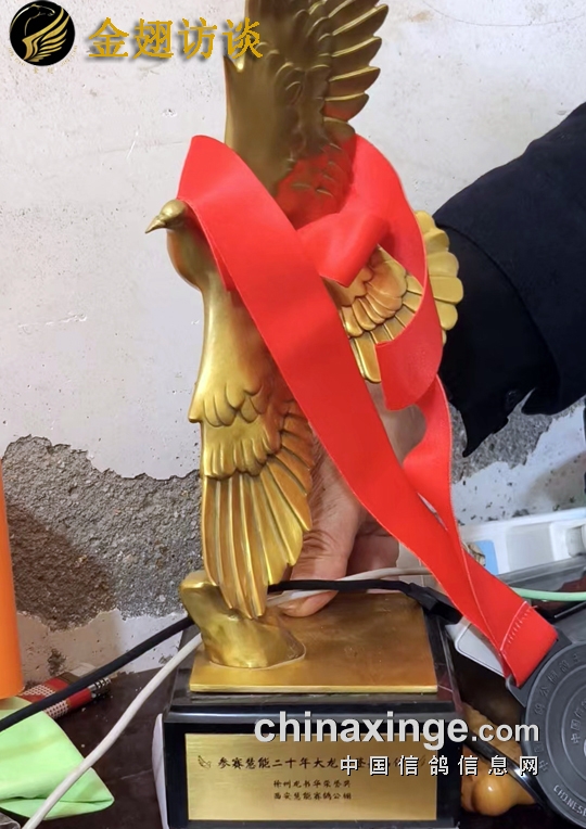 这两羽鸽子回来之后,正好我棚中有一羽朋友送的96年台鸽无宗可寻,便用它和“戈登”配对,形成了一路墨雨点、花头、插白条,黄眼、砂眼都有的一路鸽子。鸽子有了显性遗传特点之后,还要验证它们的比赛能力,几经考量后,我选定了西安威力作为“大龙戈登”的检验场。结果这路鸽子从威力到慧能一飞二十年,年年入赏,年年赢奖,以至于西安鸽友都知道有一路“黑皮”鸽子特能飞。因为“大龙戈登”在赛场上的表现,西安慧能还为我特别颁发了一座参赛20年的纪念奖杯。