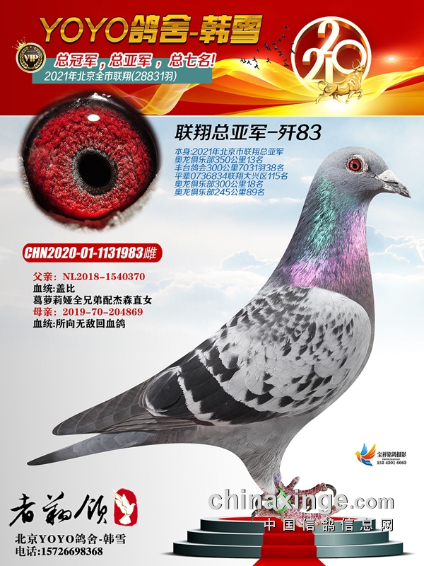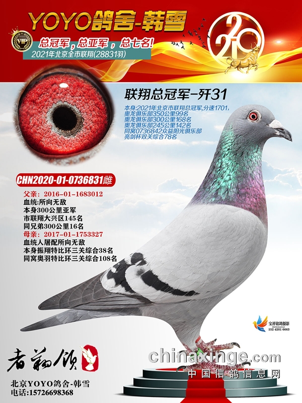 大兴区80后鸽友韩雪“独中三元”,一人包揽冠军、亚军、七名,以前十入三破纪录的成绩而名动鸽坛。冠军鸽足环号2020-01-0736831,分速1701.2910米/分,空距536.029公里。亚军鸽足环号20-01-1131983,分速1696.2541米/分。七名足环好2020-01-1513325,分速1656.873米/分。