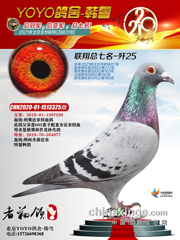 总冠军、总亚军的品系,据韩雪透露是出自“所向无敌”,2012年从德国引进,起初放在朋友舍中,就作出了不少获奖鸽,其中有300公里亚军、16名,也作出过北京市联翔145名。2014年自己重新起棚,才将这路鸽子拿回来,一直是自己的镇棚主血。