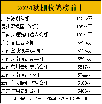 据不完全统计,截至4月9日,2024年全国秋棚累计收鸽羽数已经超过56万羽。在收鸽榜中,已有3家秋棚赢在起跑线,率先突破万羽大关,有12家突破5000羽。