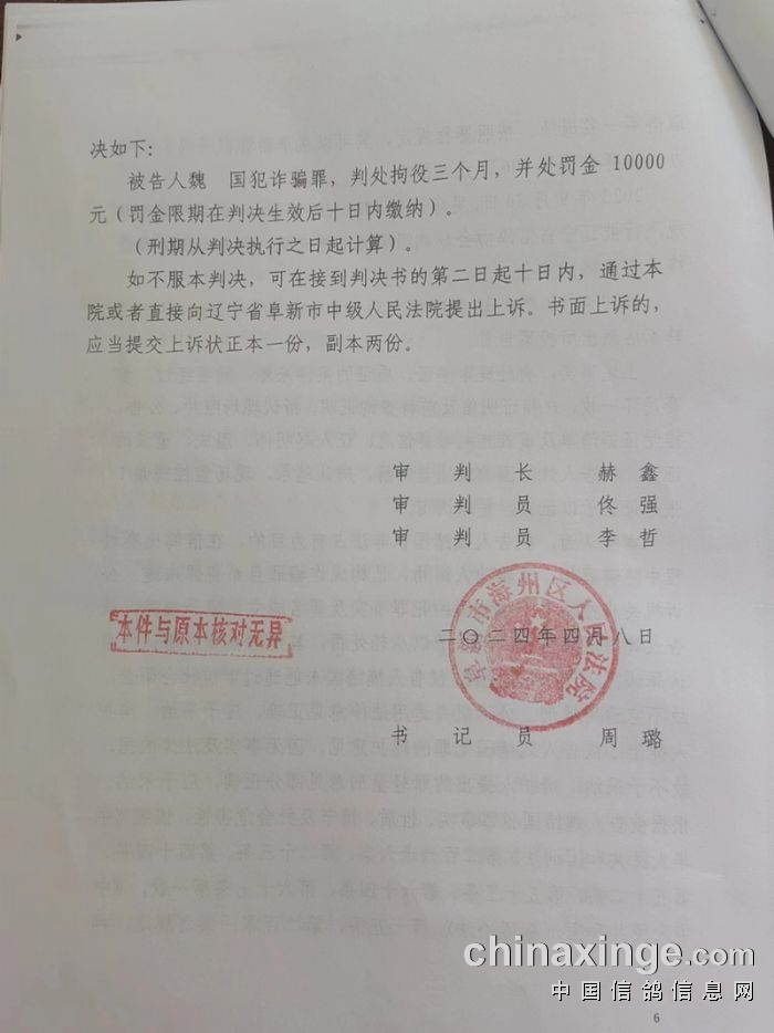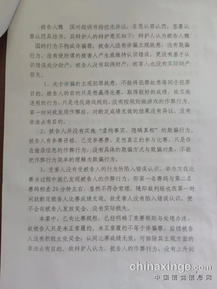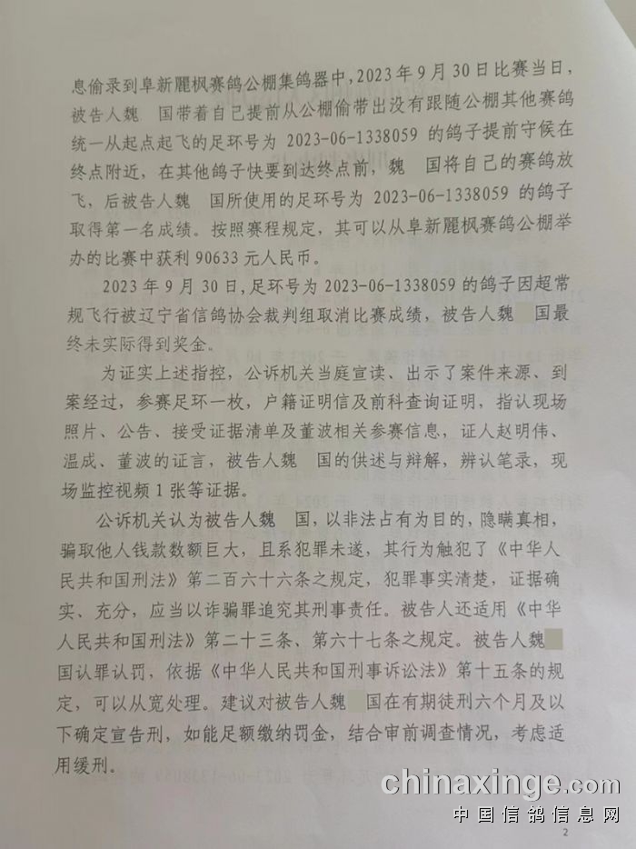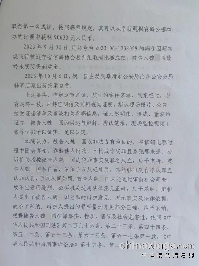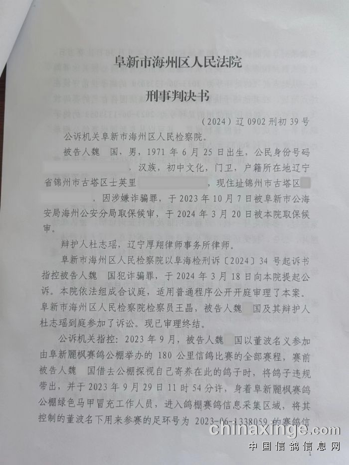 180公里冠军事件过去了6个多月之后,2024年4月9日麗枫公棚发布公告,阜新市海州区人民法院刑事判决书,这羽“超速”冠军鸽主最终以诈骗罪,被判处拘役三个月,并处罚金10000元。