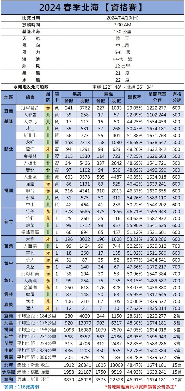受地震影响,原定于4月3日举行的2024年台湾北海春季资格赛,被推迟至4月10日正式开笼。早上7点整,30个鸽会的48028羽赛鸽从海平面放飞,出海150公里,司放时阴天,有5-6级东北风,有中大海浪。