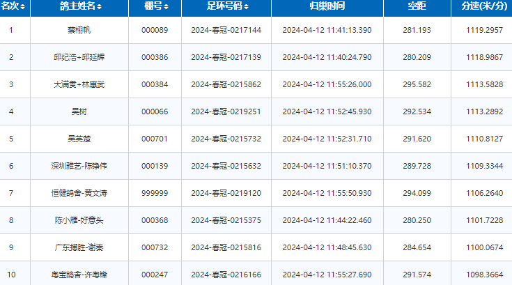 不过,严酷的淘汰,锻炼出强悍的战将,今天飞出了不错的战绩。中午11点40分就见鸽报到,冠军飞出了1119.2957米/分的速度。至下午15点30分,已报到55羽赛鸽!