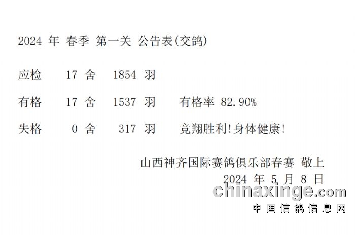 山西神齐第一关比赛集鸽工作于5月8日下午圆满完成。此次集鸽工作由山西省信鸽协会、怀仁市信鸽协会、赛鸽俱乐部全体工作人员共同完成。共有17舍1537羽有格参赛鸽。最后在监赛裁判和参赛鸽友的共同见证下,对2024年春赛第一关专用暗章进行了当众销毁。