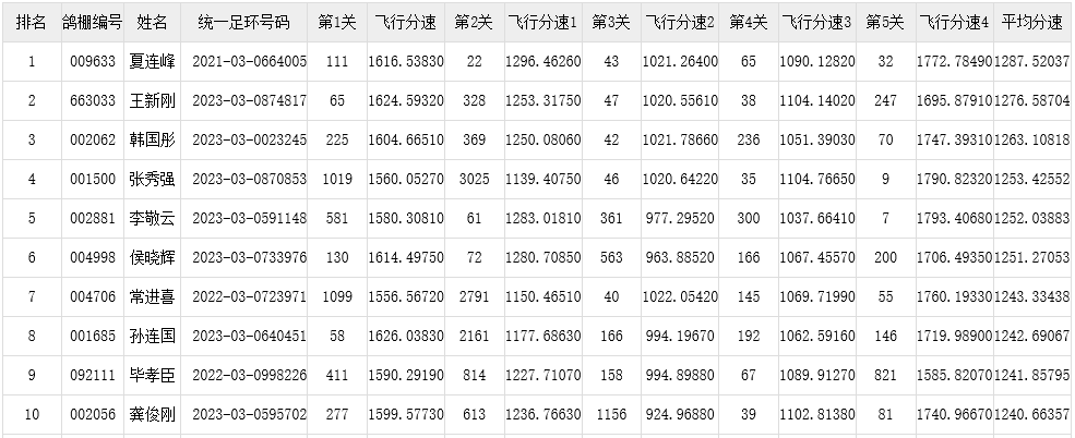 五关鸽王前10名成绩:详细>>