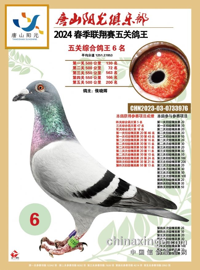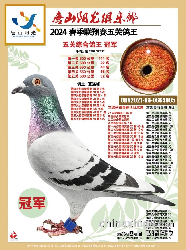 夏连峰的2021-03-0664005黄眼灰鸽快速稳定,关关都处于归巢鸽的第一集团中,飞出了一关111名、二关22名、三关43名、四关65名、五关32名高名次,平均分速为1287.5203米/分。此鸽从第三关结束开始就登顶鸽王冠军宝座,并一直领先至五关结束,最终赢得2024年唐山市春季万羽联翔赛三关、四关、五关鸽王冠军。