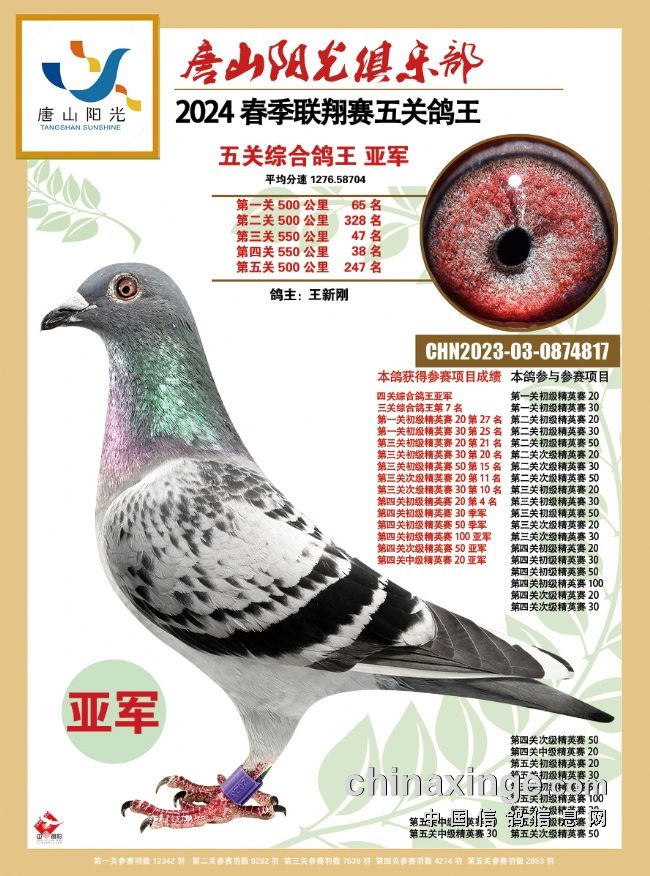 王新刚的2023-03-0874817砂眼雨点鸽也是一羽出色的战将,一关65名、二关328名、三关47名、四关38名,五关247名,从第三关就进入鸽王前10名,并保持到最后,并以1276.5870米/分的平均分速,拿下2024年唐山市春季万羽联翔赛总亚军。