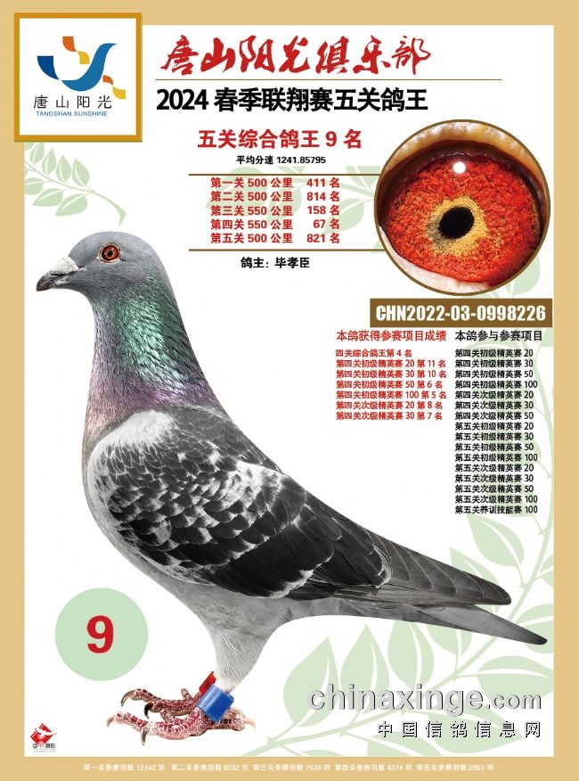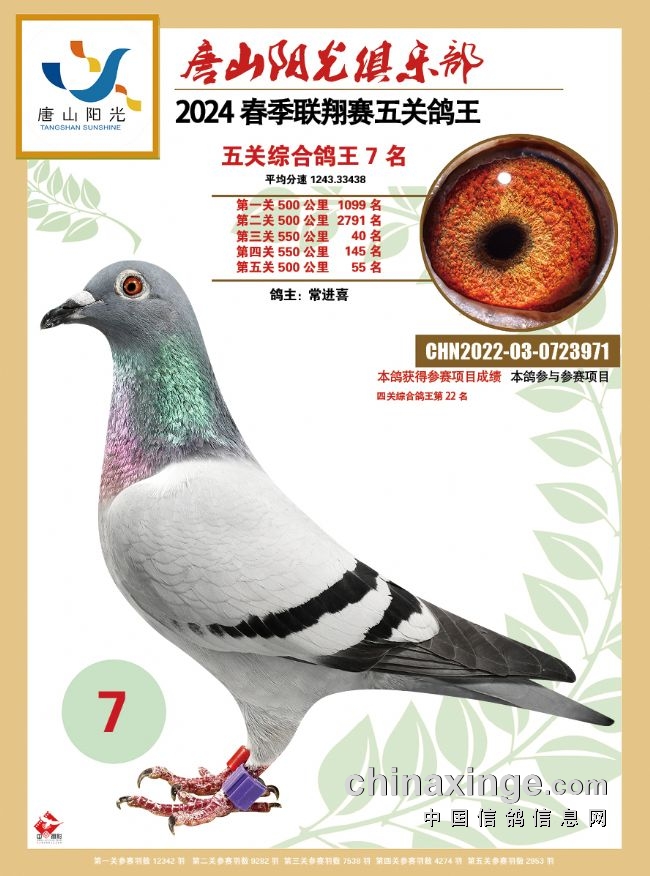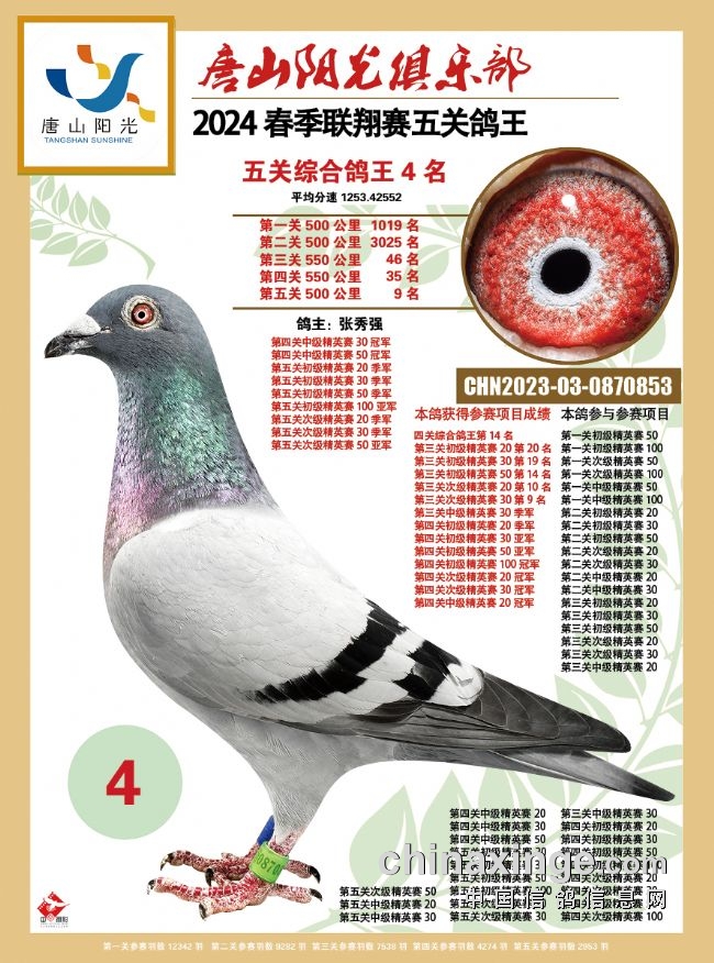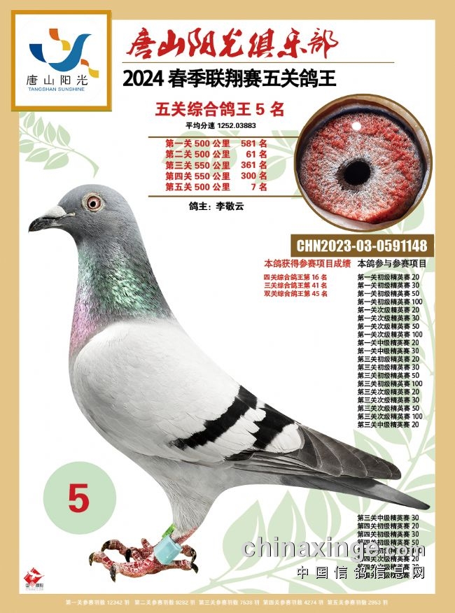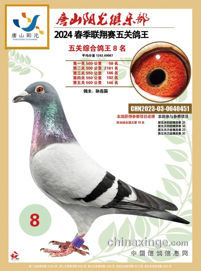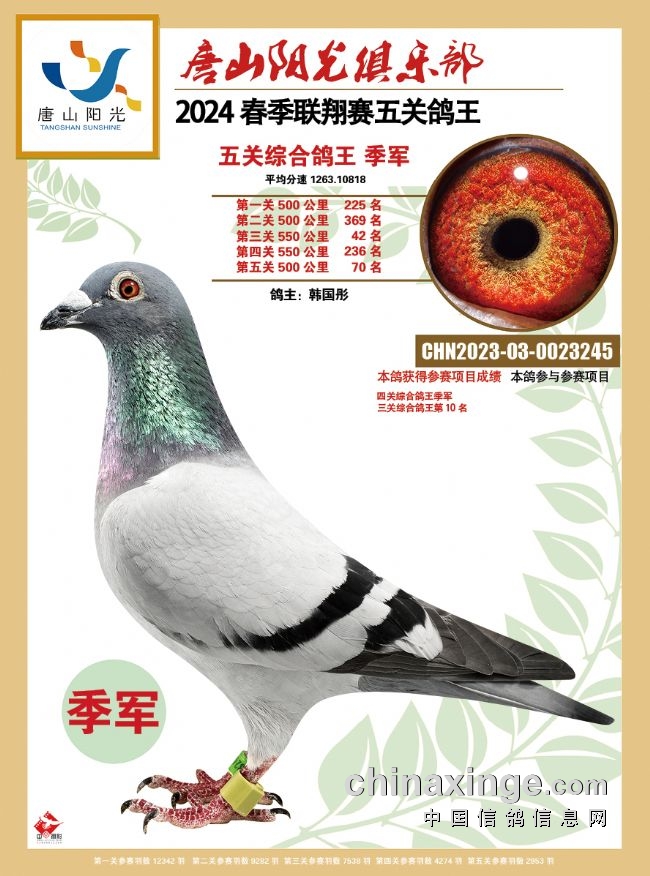 韩国彤是今年春季唐山市联翔赛发挥最出色的鸽友之一,有9羽赛鸽入围五关鸽王前100名。他的2023-03-0023245黄眼灰鸽表现强劲,一关225名、二关369名、三关42名、四关236名、五关70名,平均分速为1263.1081米/分,赢得唐山市春季万羽联翔赛总季军。