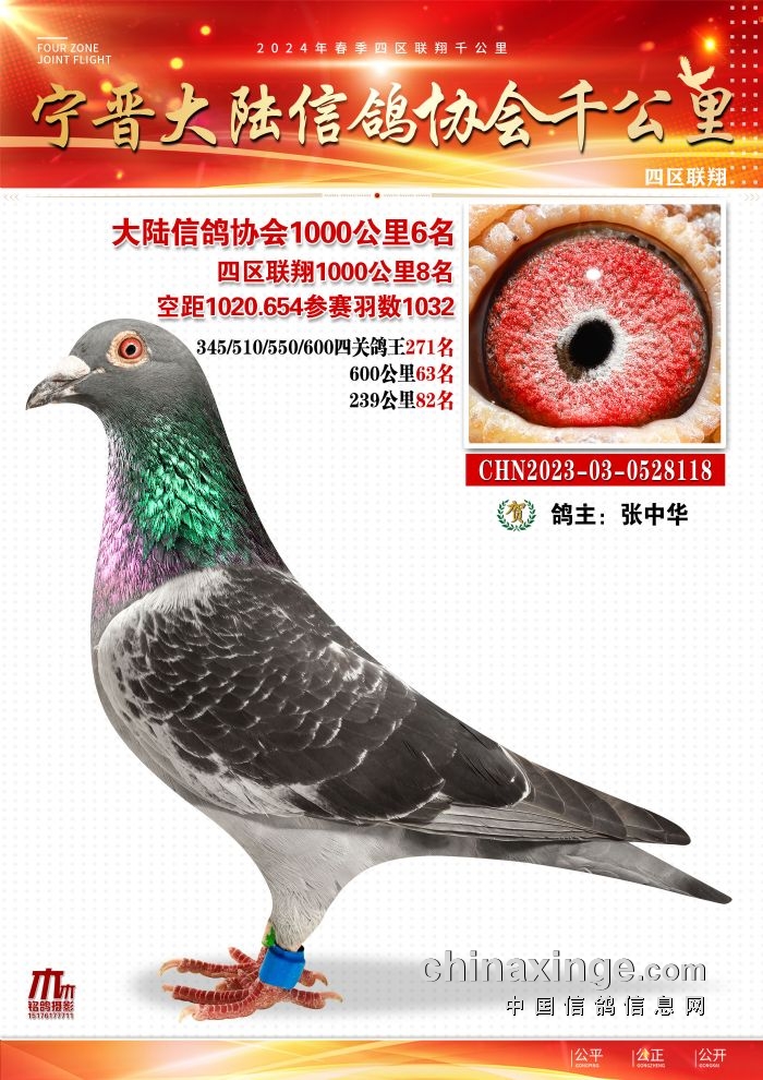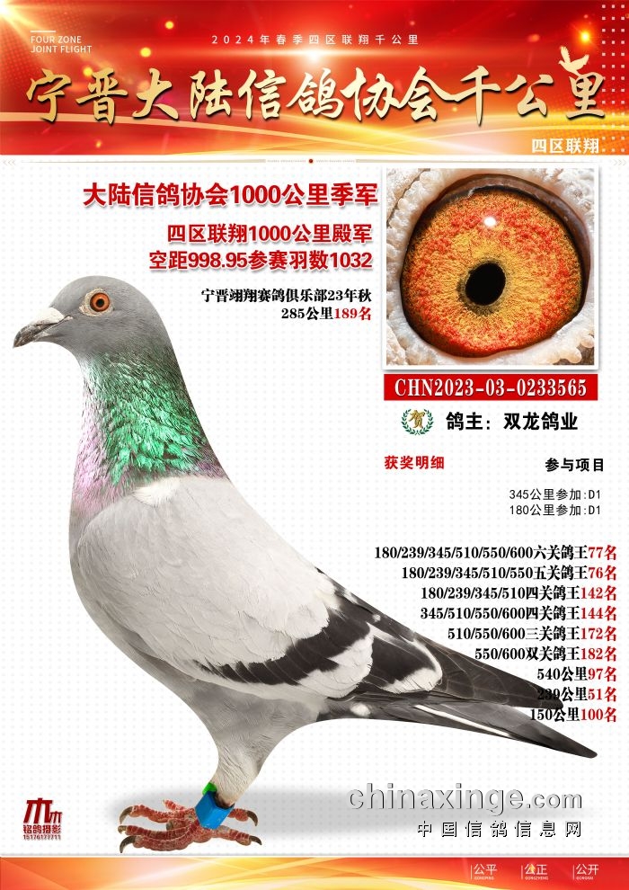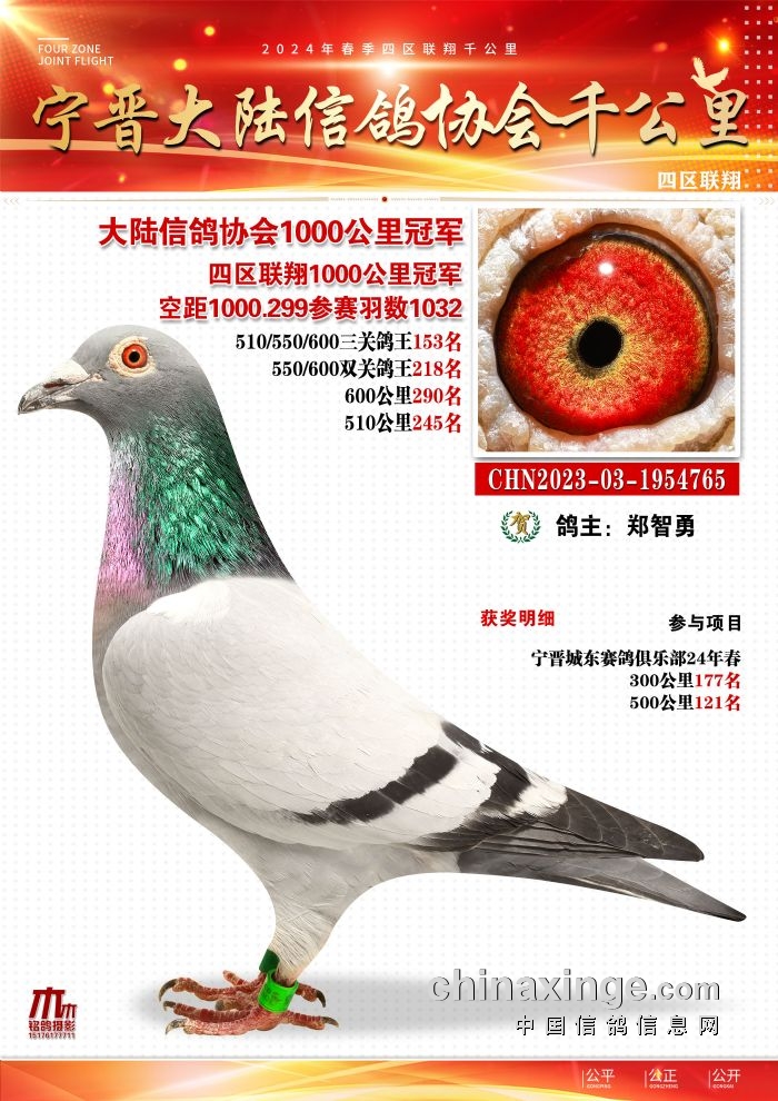此次比赛,参赛鸽友全部免费参赛,并重奖当日归赛鸽!可惜的是,今年没有当日归巢鸽。4月24日上午11点53分,第一羽归巢鸽出现在大陆鸽会,是会员郑智勇的2023-03-1954765灰鸽,飞行空距1000.299公里,分速820.221米/分,荣获本届四区联翔总冠军。这是一羽黄眼灰鸽,今年参赛了510、550、600公里的比赛,均顺利归巢,名次200多名。此次千公里一马当先,力压群雄,登顶总冠军宝座。