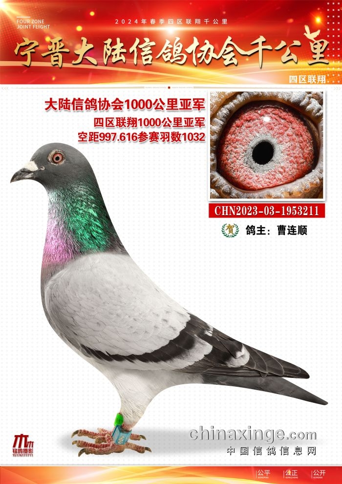大陆鸽会会员曹连顺的2023-03-1953211砂眼灰鸽,于4月24日下午14点08分02秒受伤归巢,飞行空距997.616公里,分速为736.7646米/分,超越第二羽报到鸽,赢得大陆鸽会亚军和四区联翔总亚军。