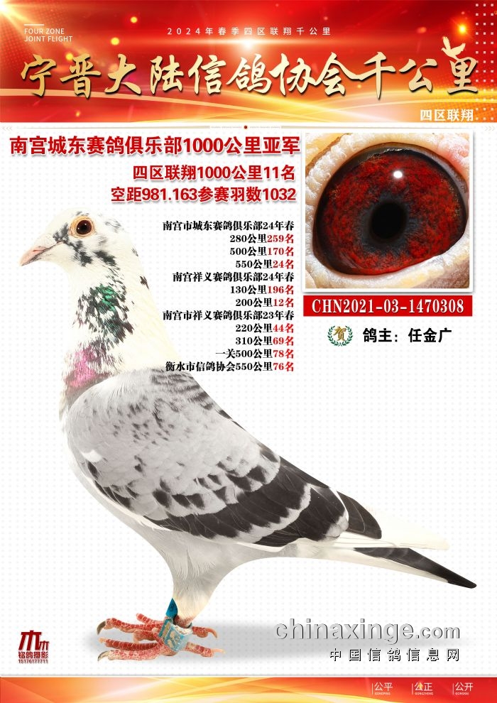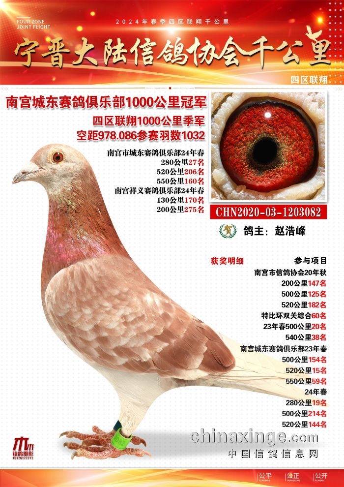 南宫城东赛鸽俱乐部会员赵浩峰的2020-03-1203082红绛鸽,于4月24日中午13点50分报进,是整场联翔赛的第二羽归巢鸽,飞行空距978.086公里,分速为731.7938米/分,获得南宫城东俱乐部冠军、四区联翔总季军。这羽威风凛凛的四岁龄大绛鸽,从2020年参加秋赛以来,多次赢得比赛好成绩,在城东俱乐部参赛,获得2023年春季520公里15名、550公里59名,2024年280公里27名,在南宫市鸽会参赛,获得2023年春季500公里20名、540公里38名。