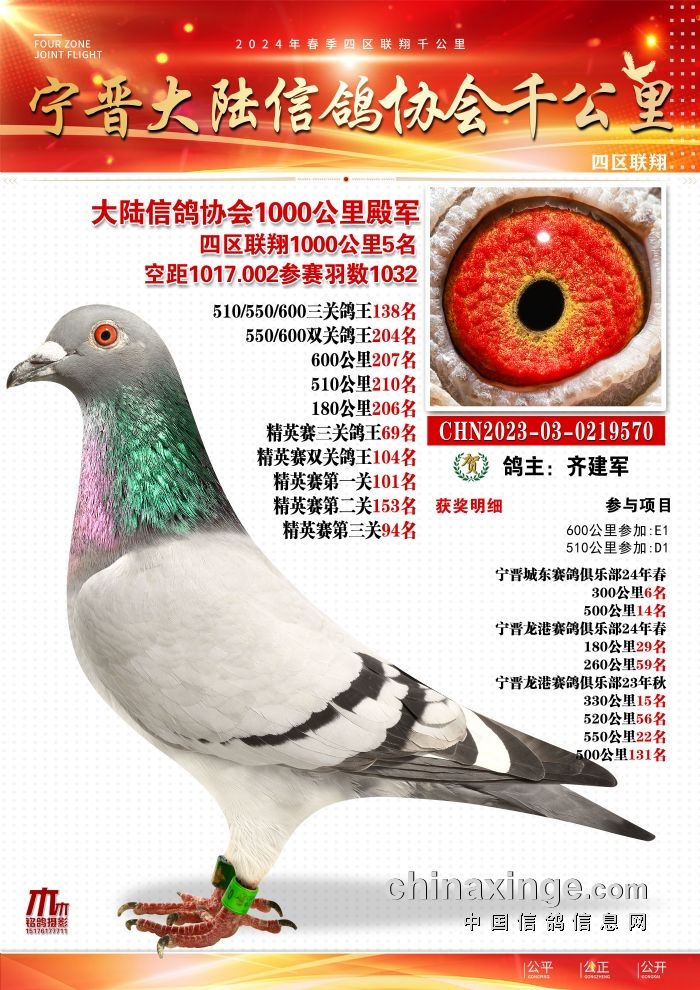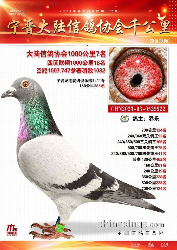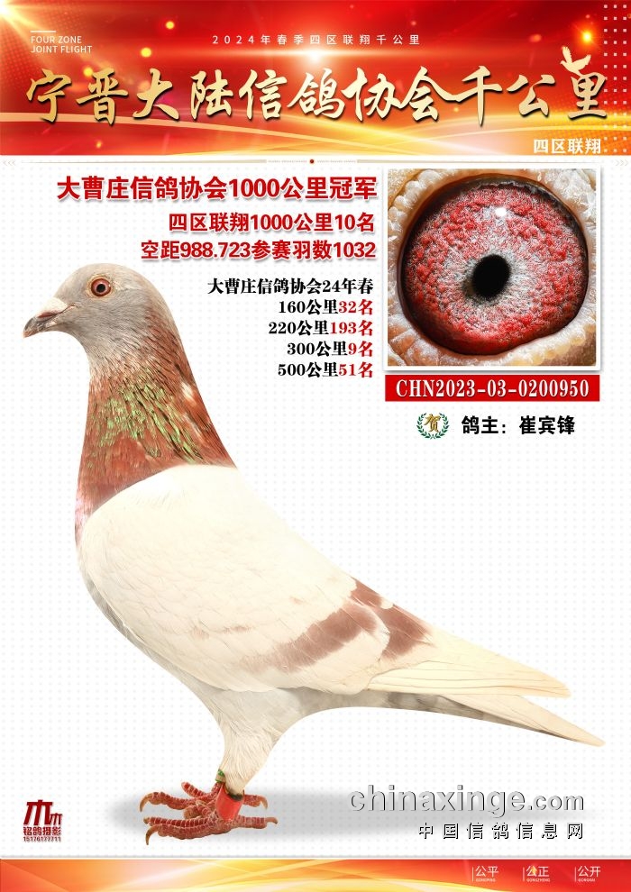 在四区联翔总成绩前10名中,齐建军的第五名黄眼灰鸽,在2023年秋季、2024年春季比赛中,中短距离均有高位成绩,获得300公里6名、500公里14名、330公里15名、550公里22名等成绩;崔宾峰的大曹庄千公里冠军、四区联翔第十名红轮赛鸽,今年春赛获得大曹庄160公里32名、300公里9名、500公里51名的成绩。
