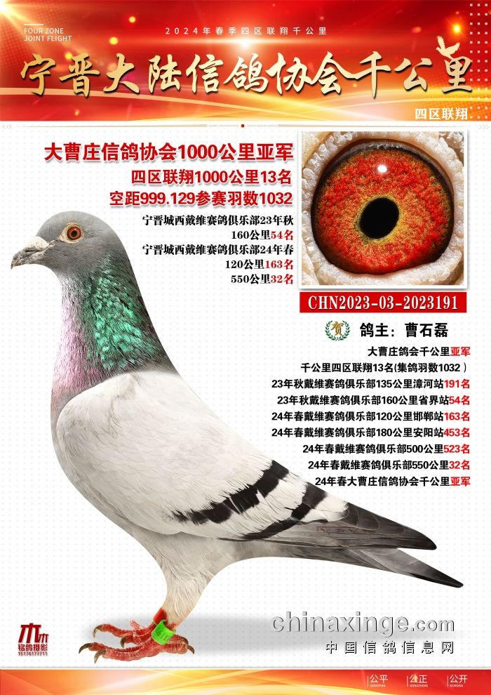 2024年春季,河北邢台市四区1000公里联翔赛,于4月23日早上5点58分开笼,司放地湘阴,其中大曹庄鸽会集鸽53羽、城西戴维赛鸽俱乐部集鸽367羽、宁晋大陆鸽会集鸽527羽、南宫城东俱乐部集鸽85羽,共计集鸽1032羽。