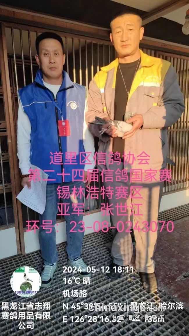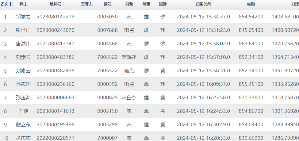 这场比赛,赛鸽飞得相当给力,下午15点31分23秒,张世江的2023-08-0243070赛鸽,第一个归巢打钟,飞行空距845.054公里,分速1400米/分,获得亚军。