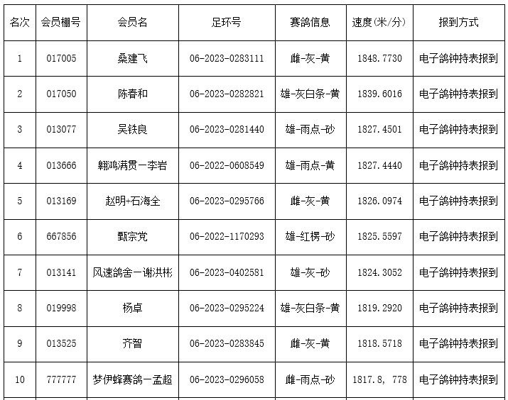 见鸽40分钟左右,比赛报满前100名,分速均在1570米以上。前10名成绩如下:详细>>