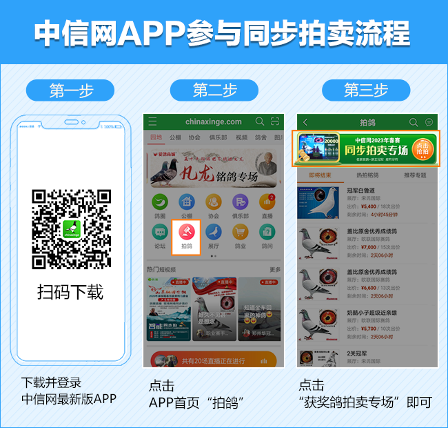 5月18-19日,安徽天宇赛鸽中心举行2024年获奖鸽颁奖暨拍卖大会,为了让全国各地的鸽友更便捷地参加拍卖,公棚与中信网合作推出“现场与网络同步拍卖+视频直播”服务,无法前往拍卖会现场的鸽友,可使用电脑或手机登录中信网,观看现场视频直播,并与现场鸽友同步出价,享受足不出户参与竞拍的便利和刺激!不便到现场的鸽友,欢迎您登录中信网参与网络同步竞拍。