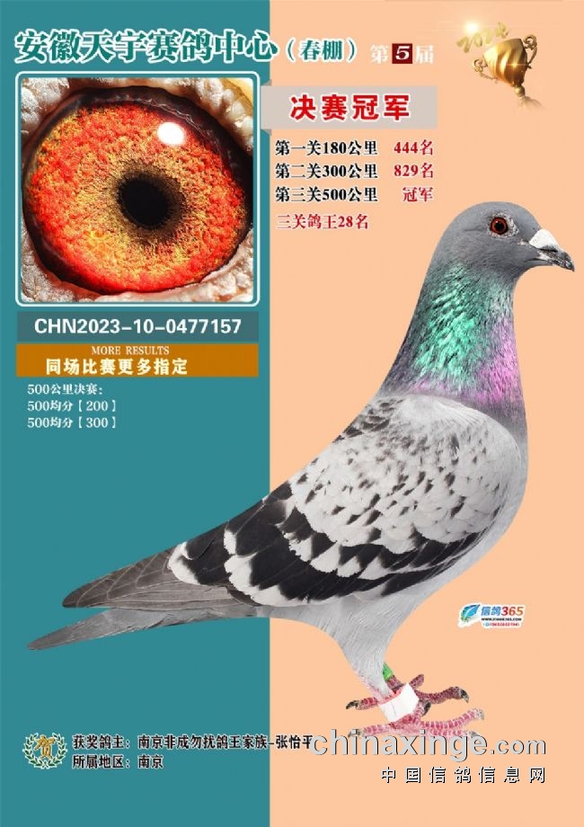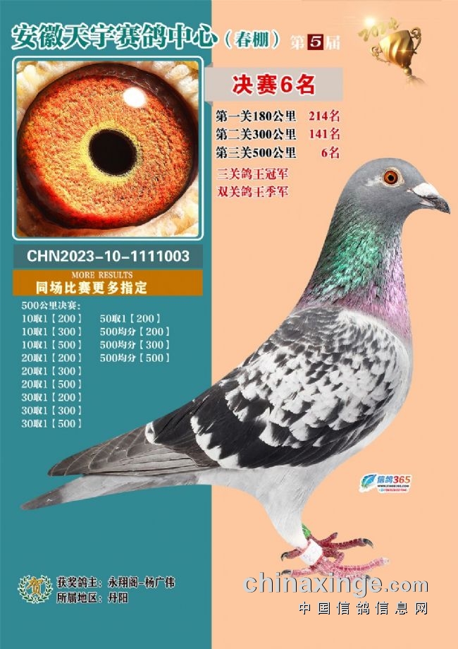 千里逆风何所惧,各路英雄显真功!5月9日,安徽天宇赛鸽中心决赛在一路逆风的情况下,奋勇飞翔500公里,两天顺利报满700个录取名次,结束所有赛程。南京非成勿扰鸽王家族-张怡平连续多年在公棚参赛,每年交鸽多羽,飞的成绩却不如意。今年总算功夫不负有心人,他成为了本届比赛的最大赢家,决赛上笼29羽赛鸽,不仅赢得冠军,还归巢13羽入围10羽,将大团体冠军一并收入囊中!丹阳永翔阁-杨广伟的2023101111003雨点鸽,三关比赛稳定发挥赢得鸽王总冠军。