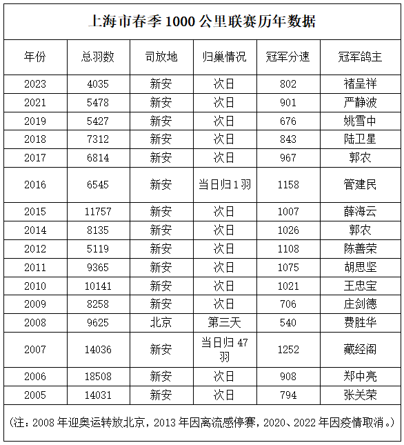 上海市1000公里联赛一直备受鸽友重视,每年集鸽羽数均在5000羽左右,最多曾超18000羽赛鸽参赛。比赛归巢情况也颇为理想,在1997、2007、2016年三度实现千公里当日归,其中2007年当日归47羽,冠军分速1252米/分。
