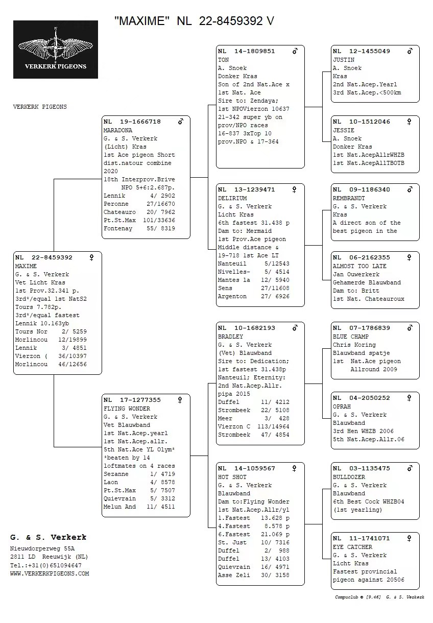 2023年佛科克创下了几项个人纪录,其中之一,就是前所未有的包揽了图尔国家赛的1-6名,其中亚军和季军更是同分同秒到达。而本场蓬特圣马斯的NPO赛冠军正是去年图尔国家赛季军,这羽取名“马克西姆”的雌鸽,在包括林克150公里10163羽NPO赛、蓬特圣马斯340公里32341羽NPO赛和图尔590公里7721羽国家赛在内的短、中、长距离比赛中均有上佳表现。