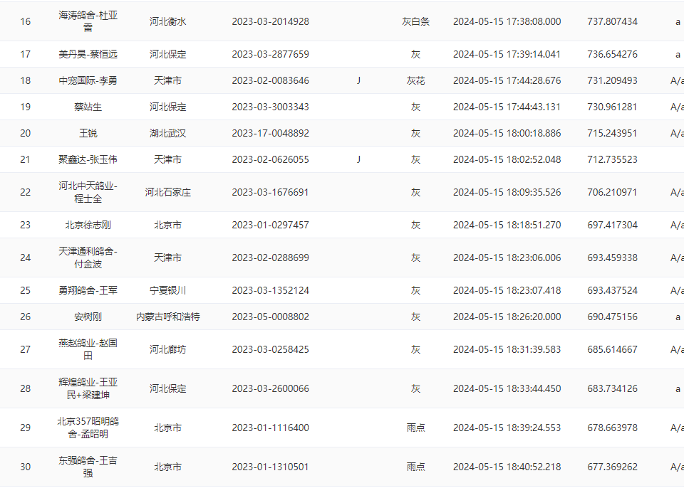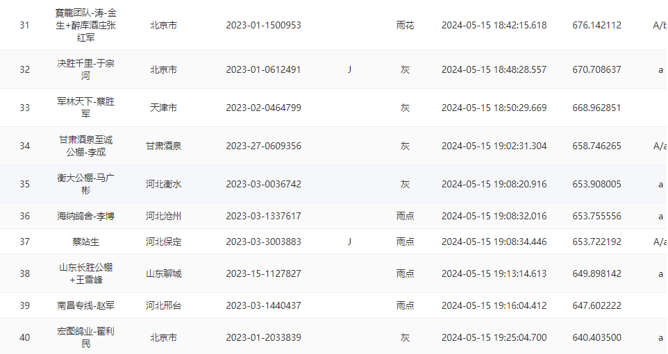 15点39分13秒,河北沧州颜亚征的2023-03-2952627灰鸽归巢报进,分速为887.9763米/分,获得亚军。紧接着,上海市高伟峰的2023-09-0239019灰鸽于15点39分45秒归巢打钟,分速为887.1617米/分,获得季军。