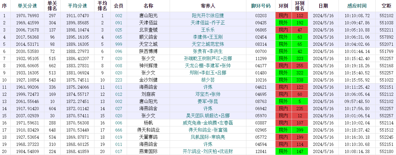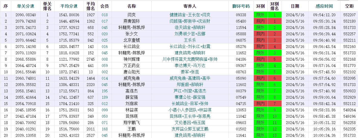 果然,放飞不到4个半小时,就迎来赛鸽归巢。院外18号棚闫爽团队麾下健捷鸽舍-王长在+闫爽的09338赛鸽,于9点54分12秒打钟报到,飞行空距552.207公里,分速高达2090.0834米/分,获得决赛冠军。一分钟后,院内17号棚燕青国际团队麾下闫越强+郭新华+沈运财的05480赛鸽报进,飞行空距552.180公里,分速高达2079.7426米/分,获得决赛亚军、院内冠军。