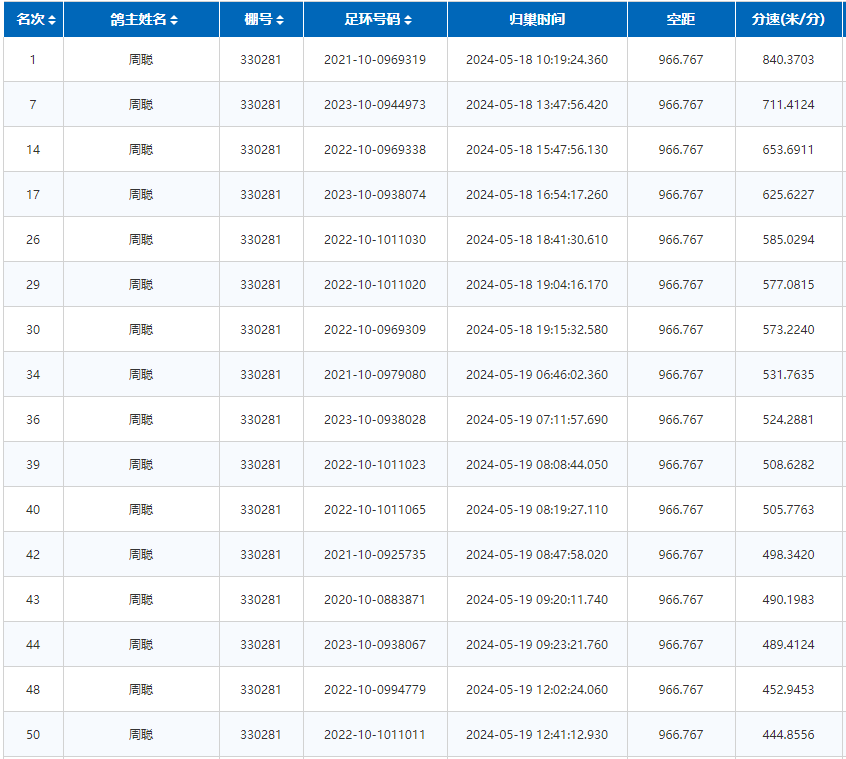 放飞当天,全省没有见鸽归巢,次日(5月18日)上午10:19:24,泗阳县众兴镇信鸽协会会员周聪见鸽报到,他的2021-10-0969319赛鸽飞行空距966.767公里,分速为840.3703米/分,赢得泗阳县众兴镇信鸽协会冠军、宿迁市总冠军。