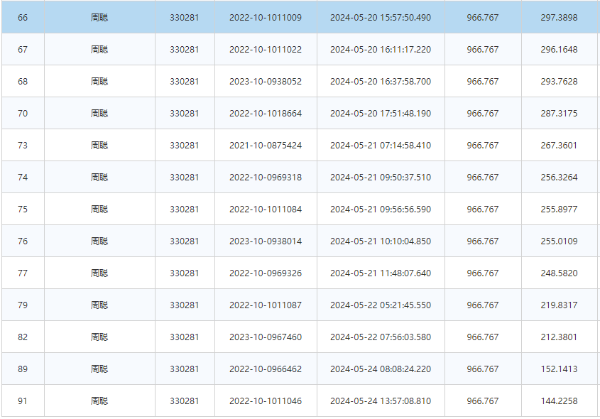 此后,他不断有赛鸽归来,5月18日报到7羽,其中有4羽赛鸽入围宿迁市前100名,分别获得冠军、34、75、89名。5月19日他报到9羽,20日报到4羽,21日报到5羽,22日报到2羽,24日报到2羽。截至5月24日,周聪一人总计归巢了29羽赛鸽。