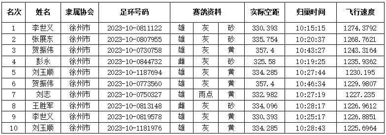 江苏省赛鸽参加短、中、长距离六个级别赛事,空距300-850公里之间。当天上午10点之后,参加300-400公里级别的徐州市见鸽报到,李世义的2023-10-0811122灰雄飞出1274米/分的速度,获得该级别冠军。