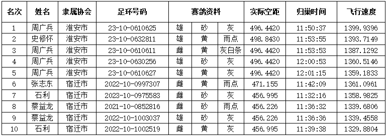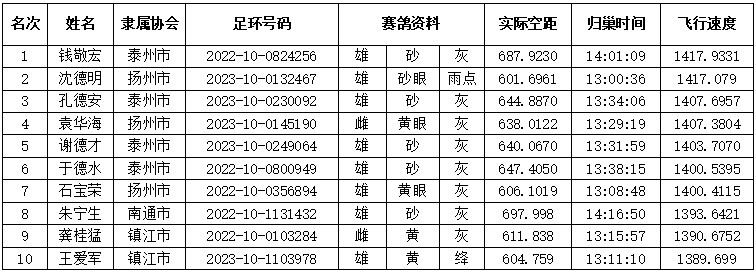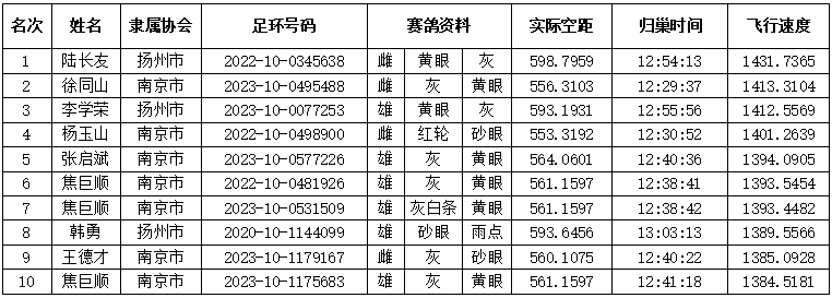 中午12点左右,淮安、 宿迁、南京、扬州、泰州、镇江等地先后迎来归巢鸽,淮安市周广兵的23-10-0610625灰雄赢得400-500公里级别冠军。比赛最高分速在500-600公里级别中诞生:扬州市陆长友的2022-10-0345638灰雌飞行598.7959公里,分速为1431.7365米/分,成为江苏省两万多羽赛鸽的分速总冠军。