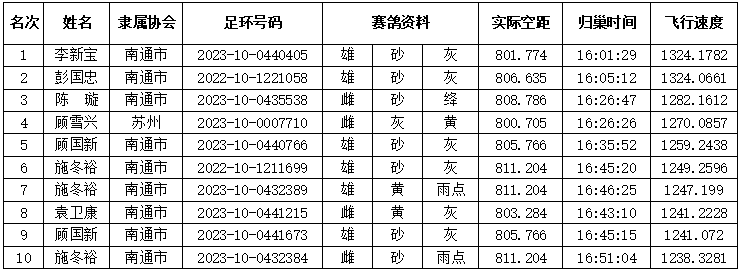 14点30分,泰州、南通、苏州地区700公里的参赛鸽报进,而空距达到800公里以上的赛鸽,也在16点之后归巢报到。泰州市钱敬宏的2022-10-0824256灰雄,赢得600-700公里级别冠军,南通市黄玉星的2023-10-0411692灰雄,拿下700-800公里级别冠军,南通市李新宝的2023-10-0440405灰雄则登顶800公里以上级别冠军宝座。