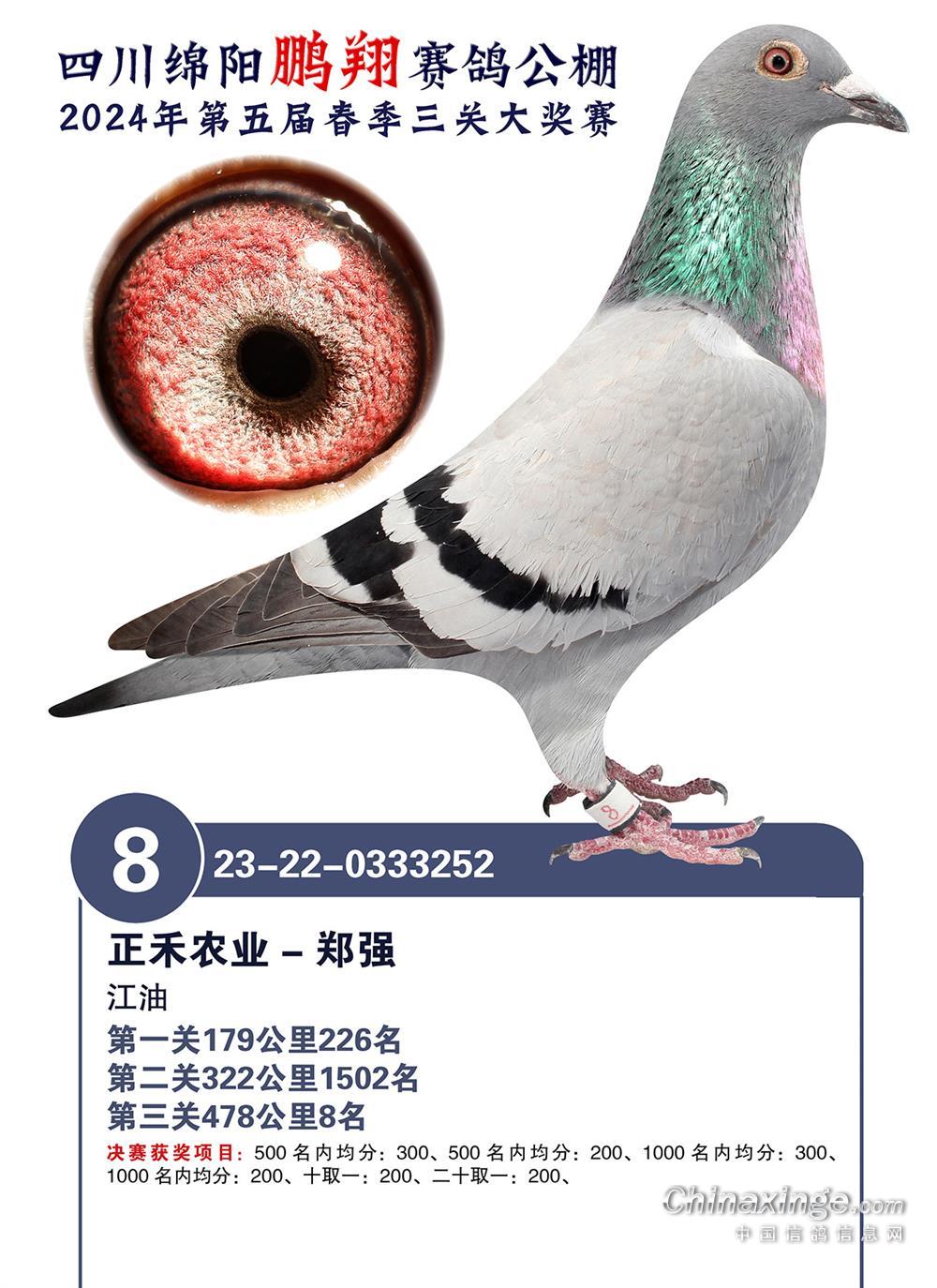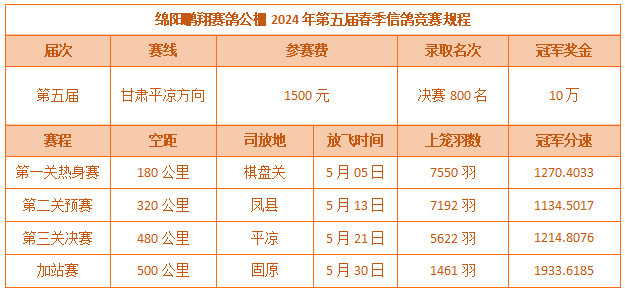 四川绵阳鹏翔赛鸽公棚2024年第五届春季信鸽竞赛,设有180公里热身赛、320公里预赛、480公里决赛,比赛收鸽超12000羽,前两关奖励100名,决赛奖励800名,冠军10万元、亚军8万元、季军6万元。