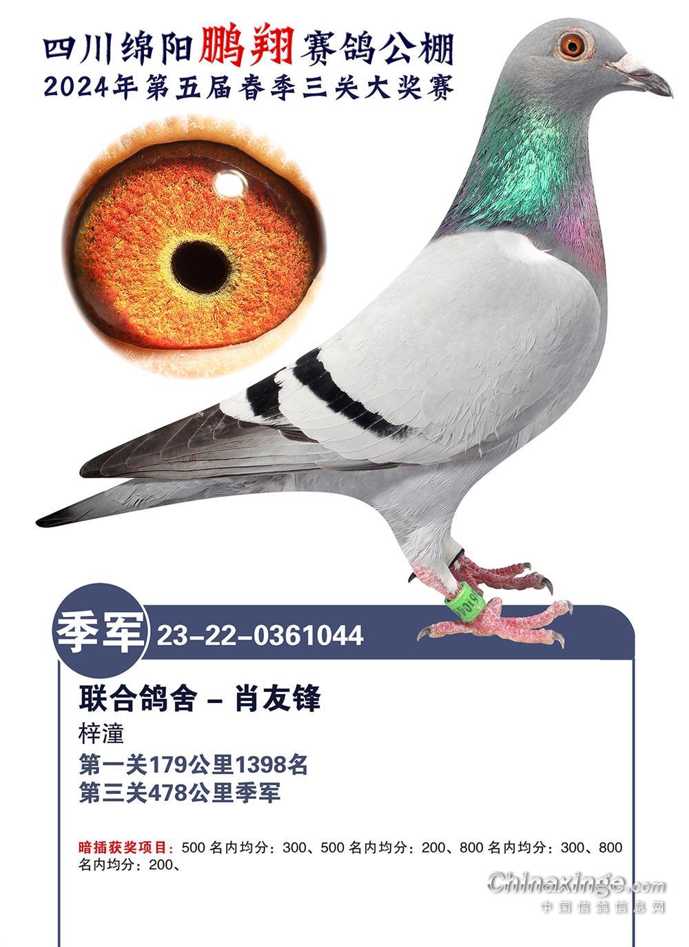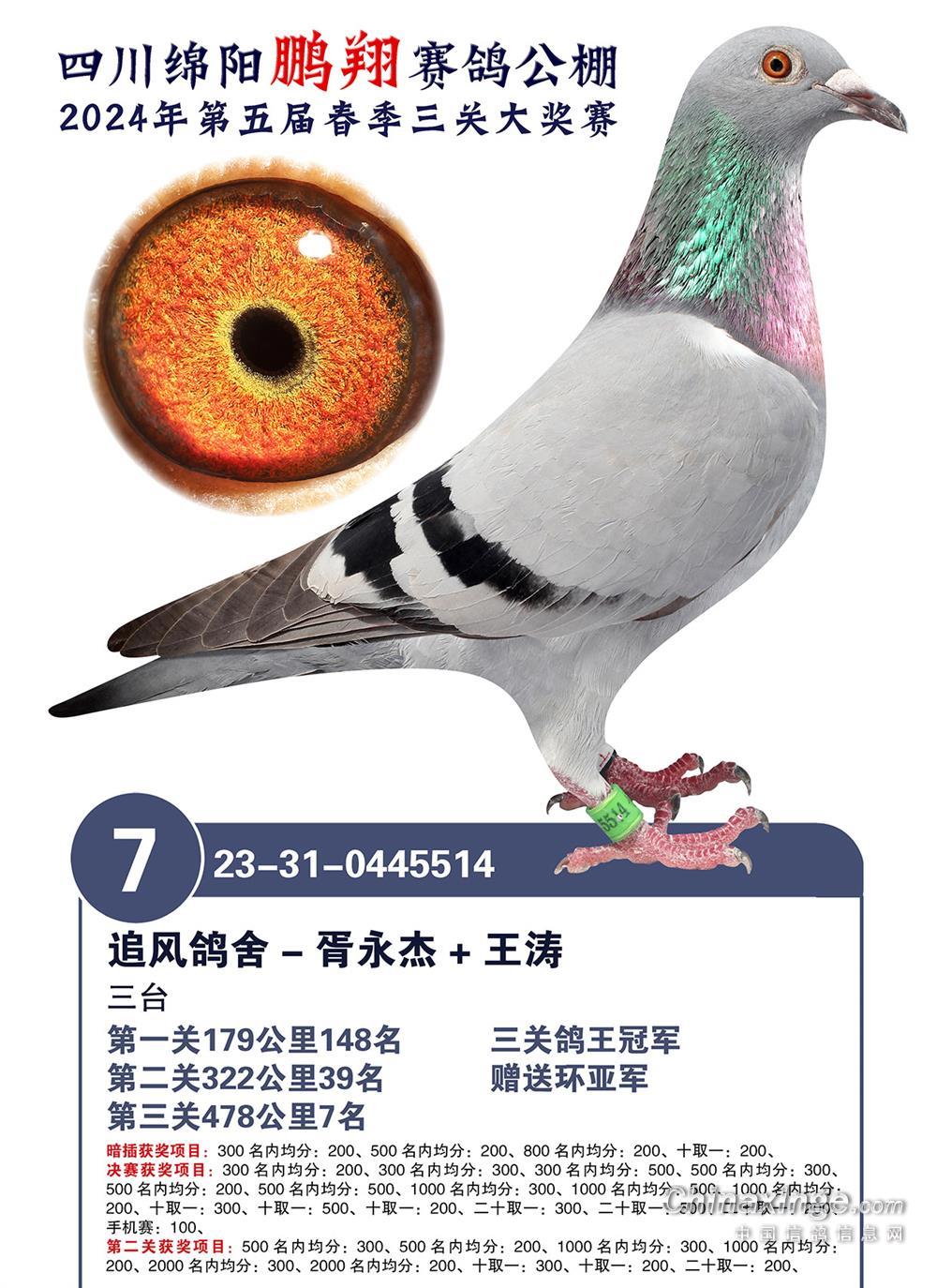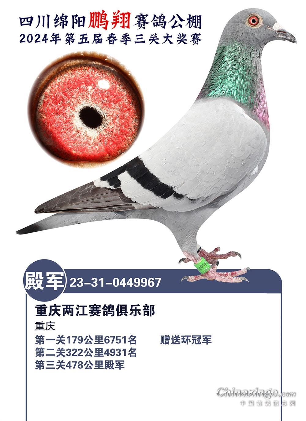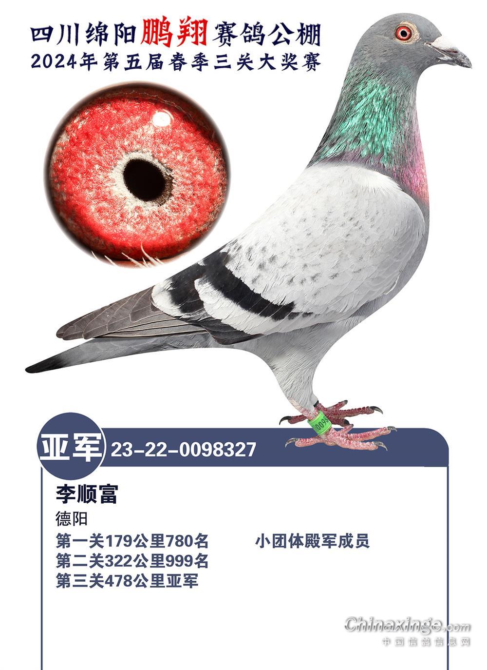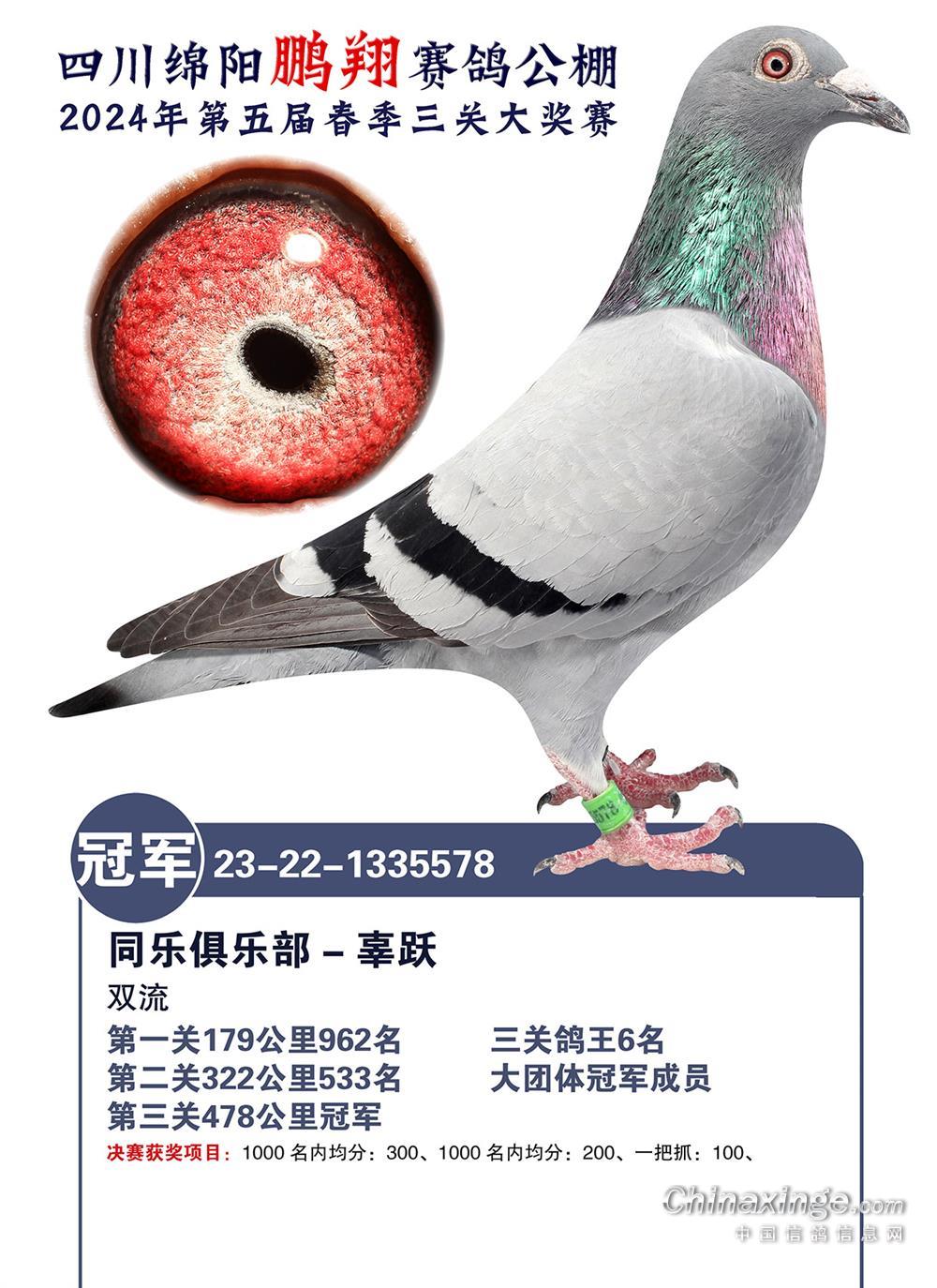 “蜀道难,难于上晴天”,说明了四川赛线之艰难,四面环山,地形复杂,赛鸽要想飞出好成绩,必须练就一身好本领,才能克服重重难关,归巢获奖。四川绵阳鹏翔公棚今年三关春赛的选手赛鸽们不畏艰难,飞出了漂亮的成绩:一关归巢率达95%,二关归巢率达77%,三关顺利报满,归巢超2000羽,加站赛更是飞出1933米/分的高分速!同乐俱乐部-辜跃2023-22-1335578灰鸽一鸽当先,荣获决赛冠军,同时作为领头鸽,还为主人赢得团体冠军立下汗马功劳。追风鸽舍-胥永杰+王涛联合选送的23-31-0445514赛鸽三关越飞越好,一关148名、二关39名、三关7名,拿下三关鸽王冠军头衔。