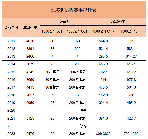 江苏省超远程赛鸽的历史上,有过辉煌的成就,放过3300公里库尔勒、3000公里吐鲁番、2500公里哈密,2000公里嘉峪关、玉门等等。而作为每一年固定的超远程赛事,是江苏省信鸽协会1500公里兰州超远程联赛,自2011年举办第一届至今,累计已激战11届(2020、2022停赛),如今已成为江苏省乃至中国超远程的金牌赛事。在过去十一届比赛中,参赛羽数最低有2057羽,最多达5879羽。