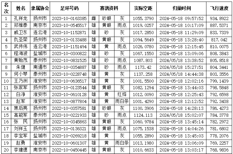 5月18日上午9点57分52秒,扬州高邮鸽会孔祥龙的2023-10-0163385赛鸽打钟报到,飞行空距1055.379公里,分速为934.8922米/分,这是整场比赛的全省最高分速,荣获1000公里以上组总冠军。