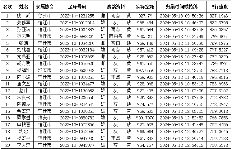 这次比赛沿途高温天气,加上侧风、逆风,当天没有赛鸽归巢报到。5月18日(次日)上午9点23分39秒,徐州市谢随心的2023-10-0805831赛鸽第一个报到,飞行空距818.545公里,分速为747.7574米/分。9点50分,徐州市姚武的2022-10-1231255赛鸽归巢报到,飞行空距927.79公里,分速为827.1943米/分,超越第一羽归巢鸽获得全省1000公里以下组冠军。