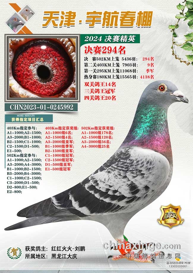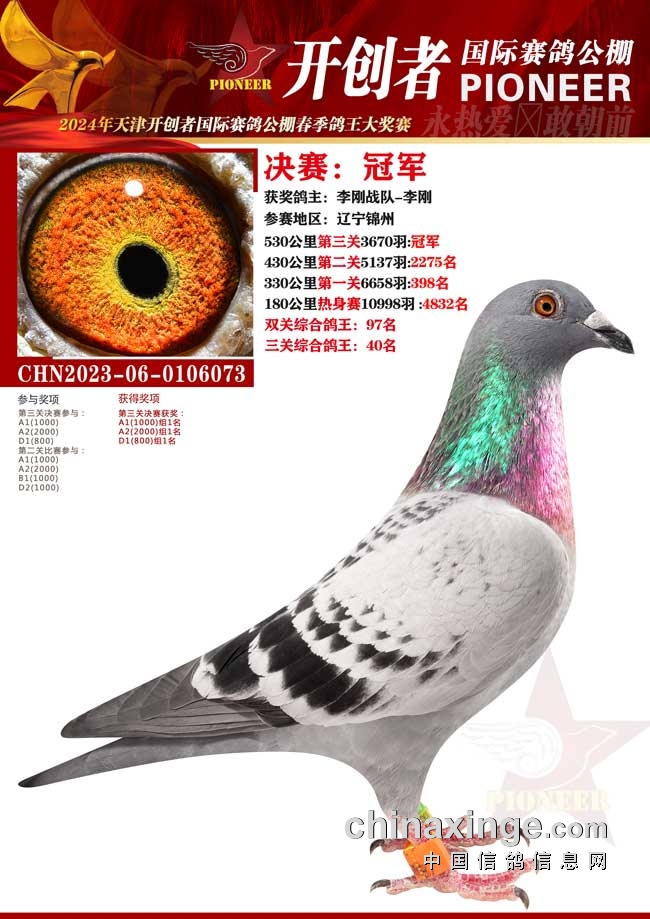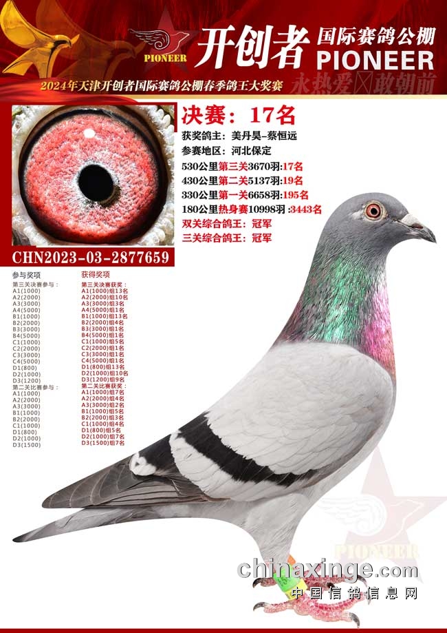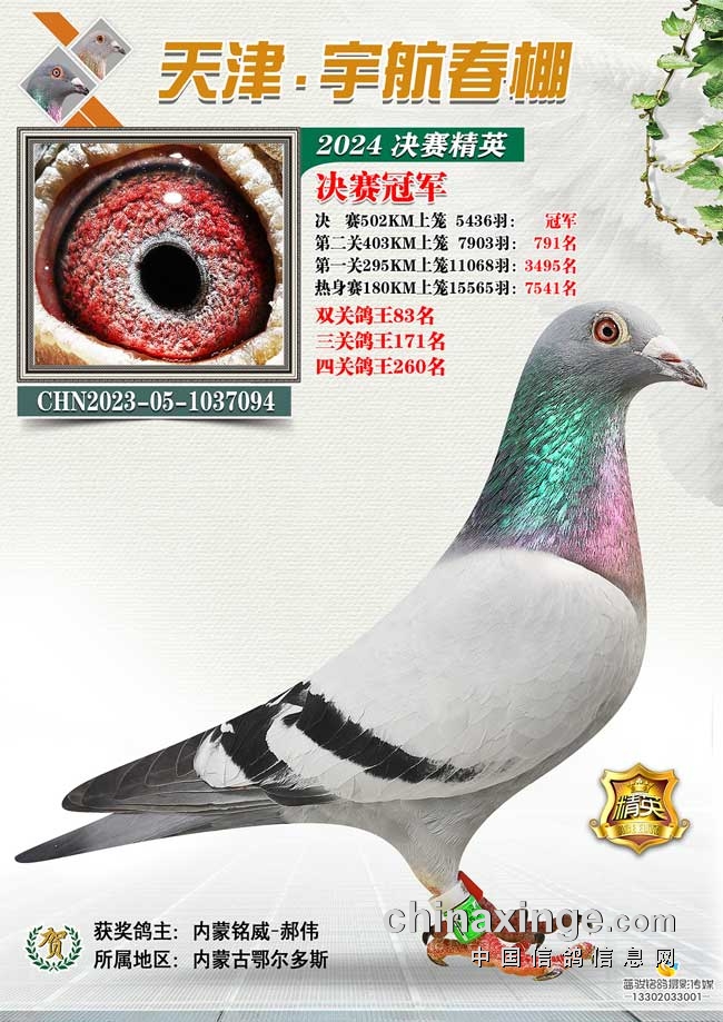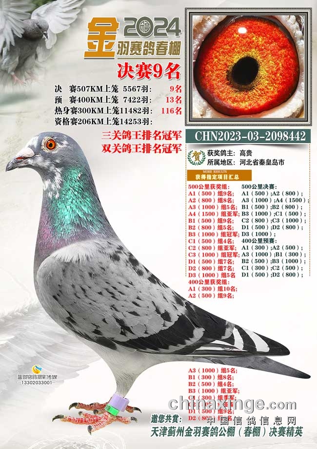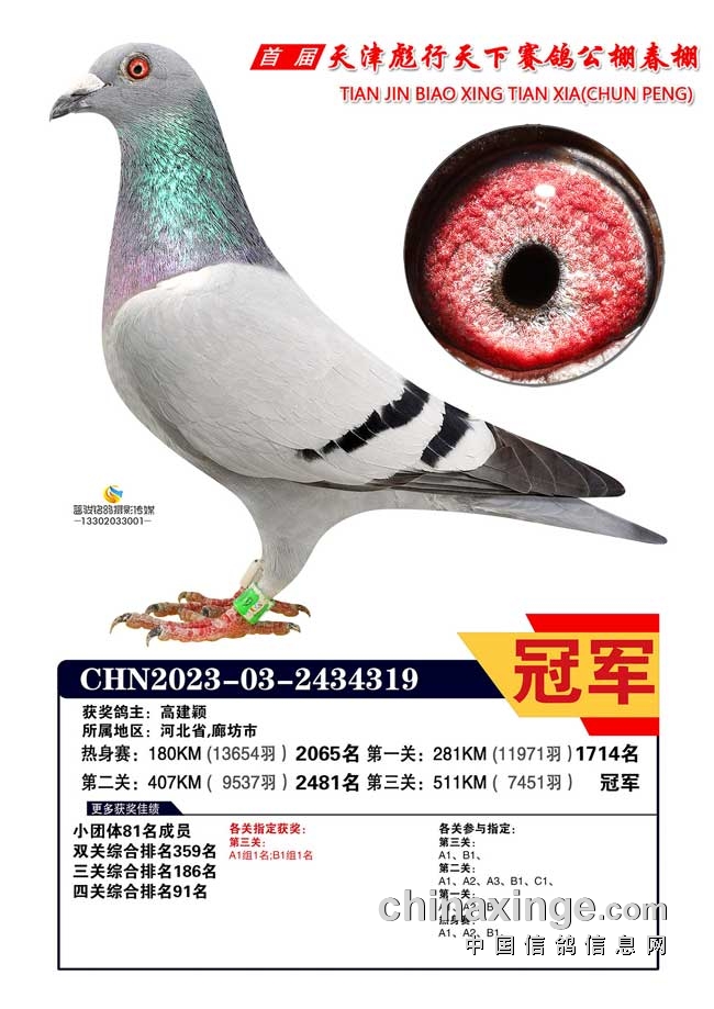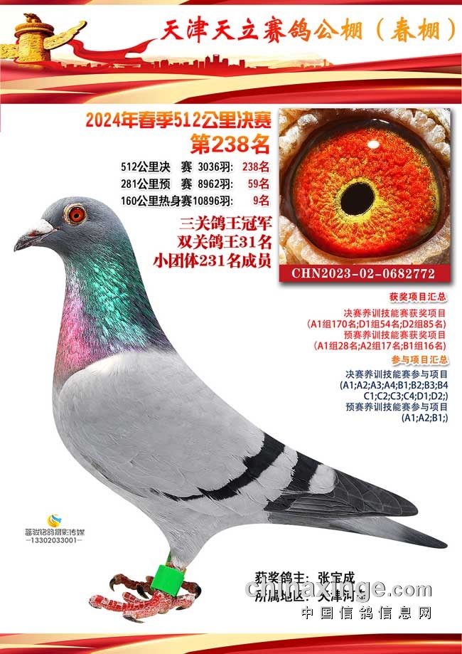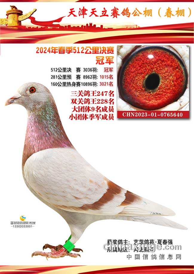 经过风雨,终见彩虹!河北燕郊艺菲鸽苑-夏春强的2023-01-0765640黄眼红轮鸽战胜一切困难,一举夺魁,赢得今年天立公棚的决赛冠军。天津河东张宝成的2023-02-0682772黄眼灰鸽三关艰难比赛都有出色发挥,最大羽数的热身赛获得10896羽9名,最艰难的预赛获得8962羽59名,决赛也在第一梯队,获得238名,荣获三关鸽王冠军。