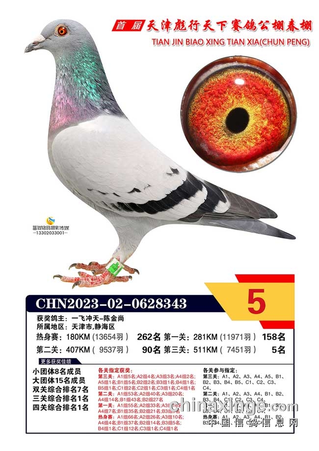 河北廊坊高建颖的2023-03-2434319砂眼灰鸽,热身赛、第一关、第二关名次均在1700名开外,但决赛成为一匹“黑马”,领先其余7400多羽赛鸽,赢得冠军。一飞冲天-陈金尚的2023-02-0628343黄眼灰鸽,在春赛的四场比赛中,真的“一飞冲天”,分别获得262、158、90、5名,荣膺三关鸽王冠军、四关鸽王冠军。