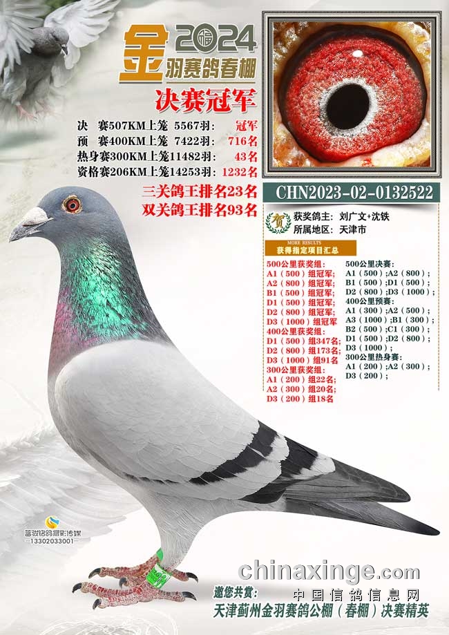 天津本地鸽友刘广文+沈铁联合选送的2023-02-0132522砂眼灰鸽,热身赛、预赛、决赛关关为主人赢得奖金,决赛更是击败5500多羽赛鸽,荣获冠军。秦皇岛高贵的2023-03-2098442花头黄眼雨点鸽,资格赛迟归没有成绩,但热身赛、预赛、决赛关关飞高位,分别获得116、13、9名,赢得双关鸽王冠军、三关鸽王冠军。