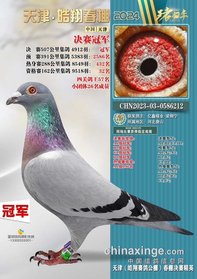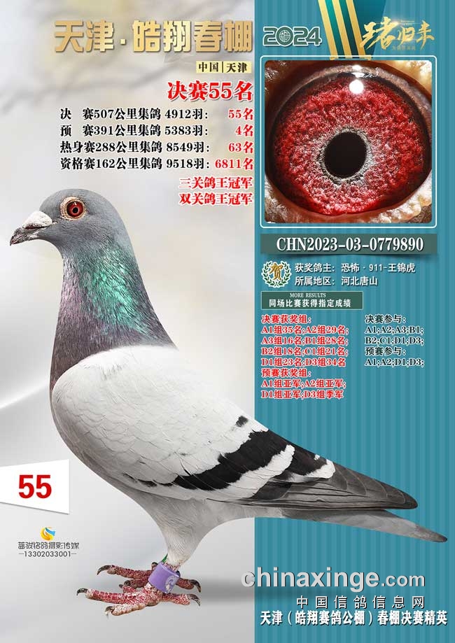 河北唐山亿鑫煤业-梁朔宁的2023-03-0586212砂眼灰鸽,资格赛、热身赛都发挥出色,分别获得32名、432名,预赛调整了一关,在决赛上爆发全部能量,荣获冠军。河北唐山强豪恐怖·911-王锦虎的2023-03-0779890砂眼灰鸽,热身赛、预赛、决赛均飞进前100名,分别获得63、4、55名的优异成绩,获得双关鸽王冠军、三关鸽王冠军。