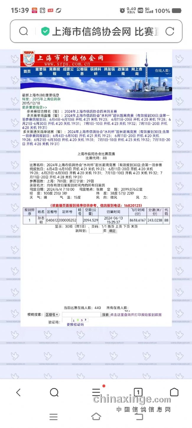 6月13日下午15点25分37秒,上海市-张掖超远程第一羽赛鸽报到,历时10天,是宝山区孙志明的200005252赛鸽,飞行空距2094.529公里,分速为243.0238米/分。