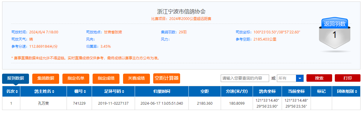浙江宁波市信鸽协会2024年2000公里超远程集鸽29羽,于6月4日早上7点18分,与上海市信鸽协会赛鸽统一放飞,共计放飞810羽,其中上海市781羽,浙江宁波29羽。