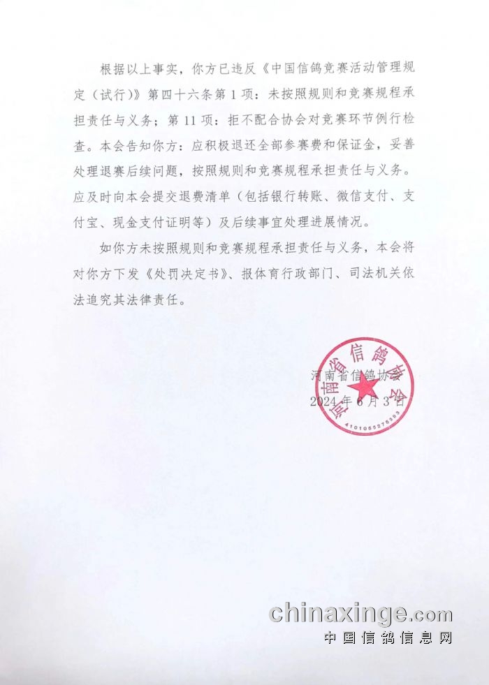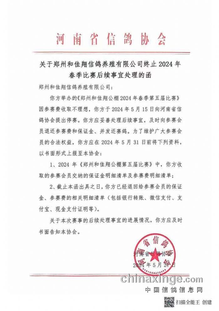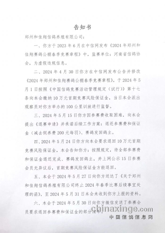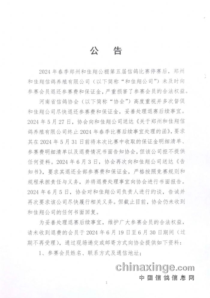 一个月过去了,6月19日,河南省信鸽协会发布了一则公告,内容讲诉了“关于和佳翔公棚未及时翔参赛会员退还参赛费和保证金”的事宜。详情情况如下: