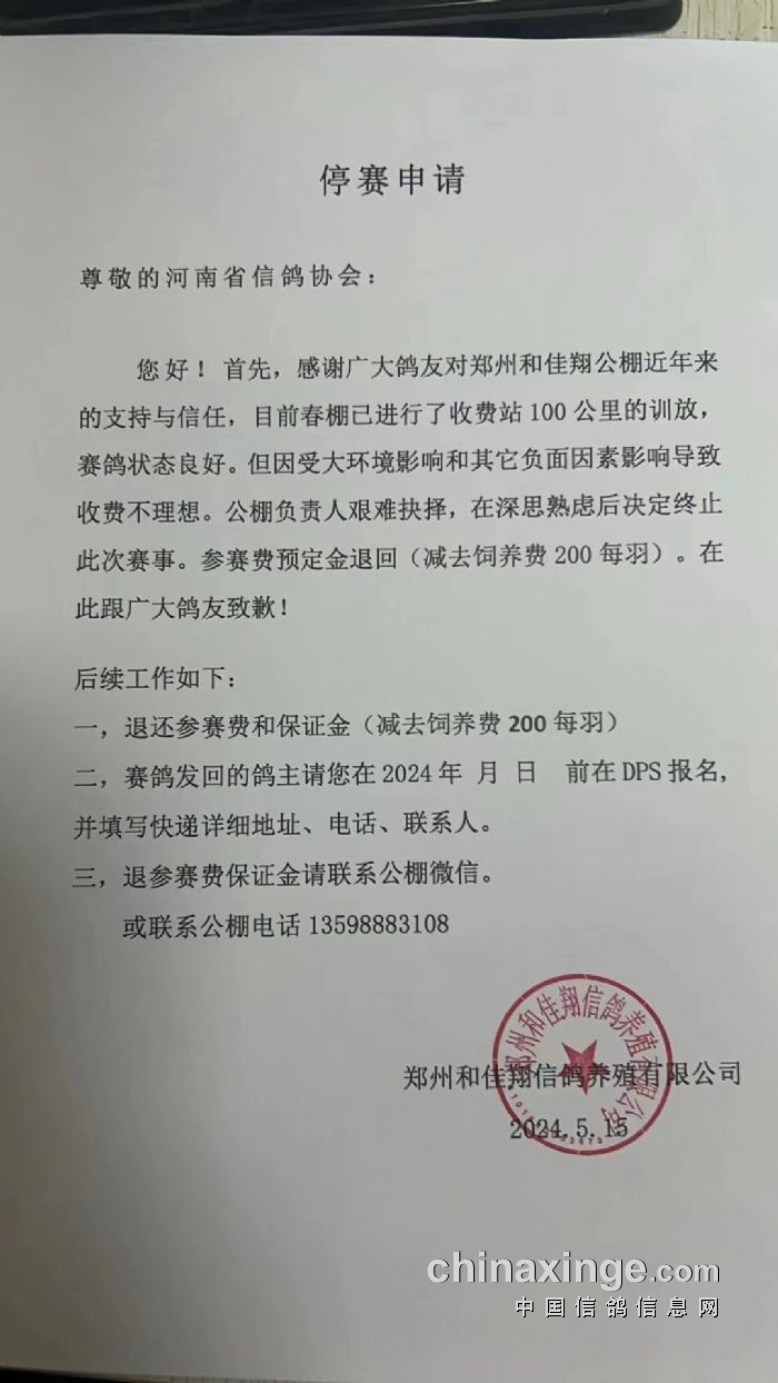 今年5月中旬,河南郑州和佳翔公棚在进行万100公里训放收费站之后,由于收费不理想,发布了终止比赛公告:“因受大环境影响和其它负面影响导致收费不理想。公棚负责人艰难抉择,在深思熟虑后决定终止此次赛事。参赛费预定金退回(减去饲养费每羽200)……”