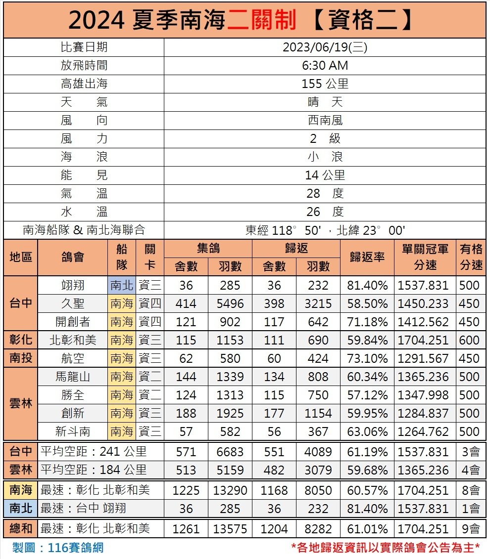今年南海夏季赛分别设一关制、二关制两种赛制,其中一关制,即一周一关比赛;二关制则是一周两关,三、四天一关比赛。本场比赛为二关制资格赛第二关比赛,有台中、彰化、南投、云林等地区9家鸽会参赛,总计1261舍、13575赛鸽上笼。最终有效归巢1204舍、8282羽赛鸽,总归巢率为61.01%。最高分速为1704.251米/分,出现在彰化区北彰和美鸽舍。