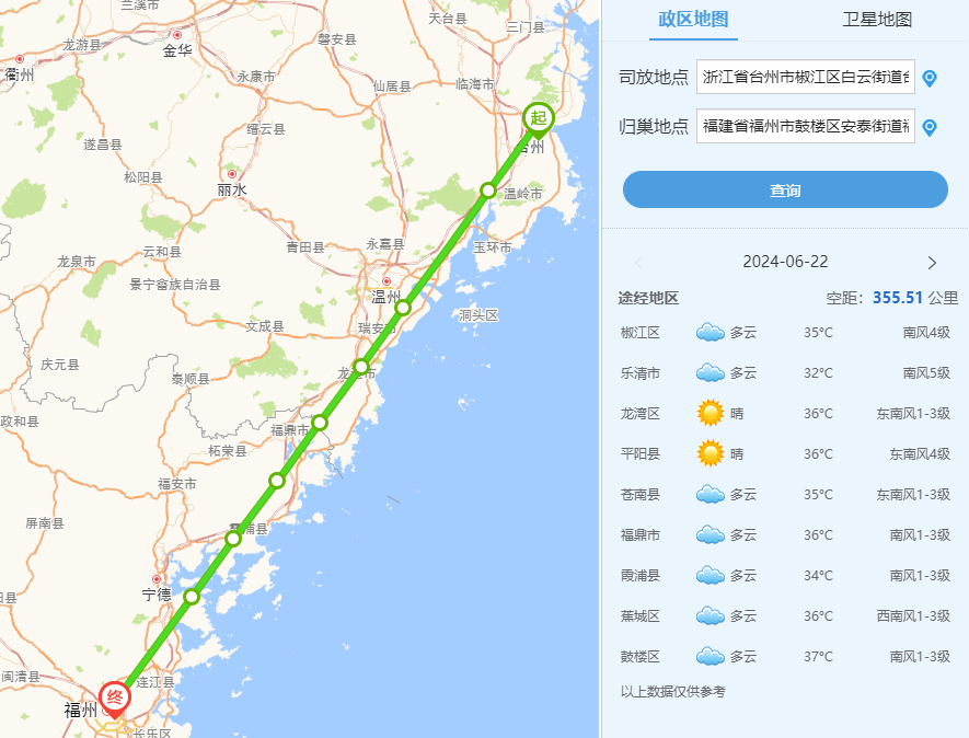 5.福建平潭信鸽协会2024年夏季三关大奖赛第一关比赛,6月22日早上5点32分在浙江台州温岭服务区开笼,共计307羽赛鸽参赛,空距356.474公里。