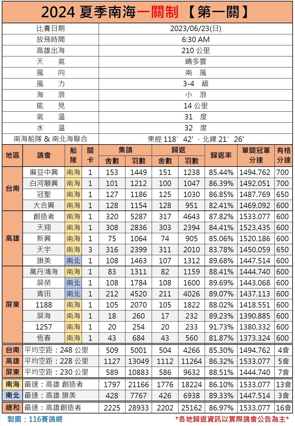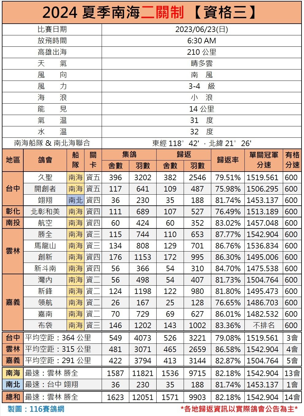 今年南海夏季赛分别设一关制、二关制两种赛制,其中二关制是一周两关,三、四天一关比赛。本场比赛为二关制资格赛第三关,有来自台中、彰化、南投、云林、嘉义地区14家鸽会参赛,总计1623舍、12051羽赛鸽。最终有效归巢1571舍、9903羽赛鸽,总归巢率82.18%。最高分速1542.904米/分,出现在云林区胜全鸽会。