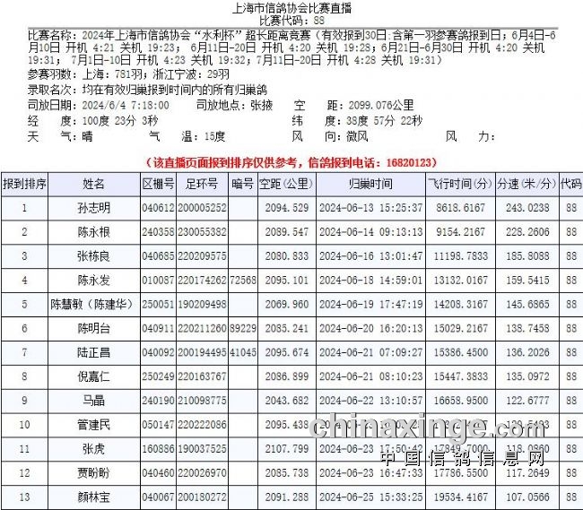 2024年上海市信鸽协会“水利杯”超长距离竞赛,比赛共计上笼810羽,其中上海市781羽,浙江宁波29羽。比赛从6月4日早上7点18分在张掖开笼放飞之后,至今已是第23天,共计归巢13羽赛鸽。