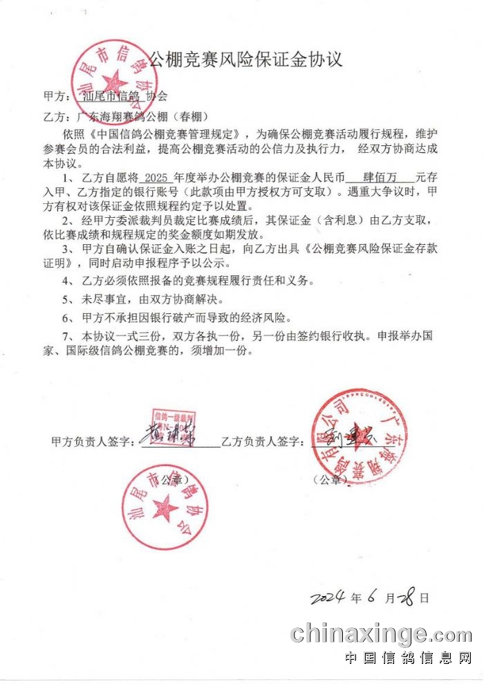 为维护参赛会员的合法利益,提高公棚的公信力,现广东海翔赛鸽公棚(春棚)将2025年度举办公棚竞赛的保证金人民币:肆佰万元整存入汕尾市信鸽协会指定的银行账户(此款由鸽协授权方可支取),请各位会员安心参赛!