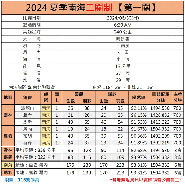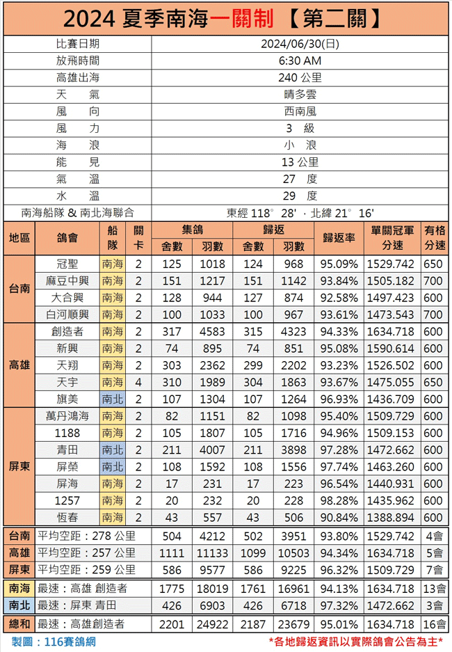 台南、高雄、屏东共计16个鸽会举行一关制比赛,本关比赛总计2201舍、24922羽赛鸽出海比赛。这关比赛在好天气助阵下,飞出了好成绩,最高分速1634米/分,有的鸽会归巢率达98.28%。最终,一关制全船共计2187舍、23679羽赛鸽归巢,整体归巢率高达95.01%!